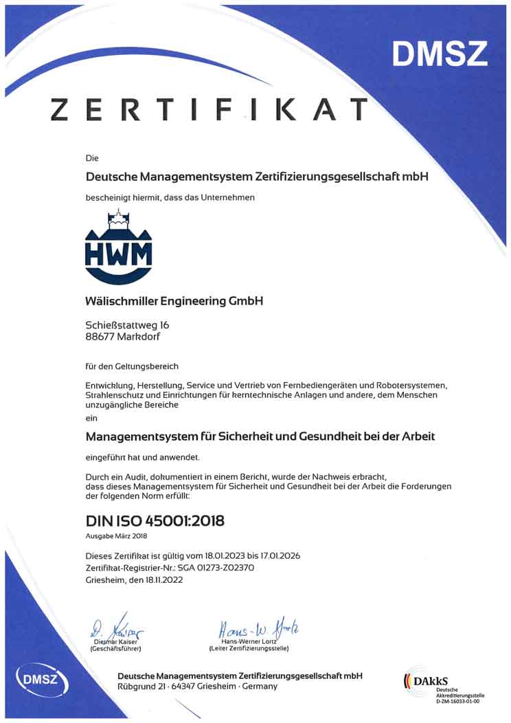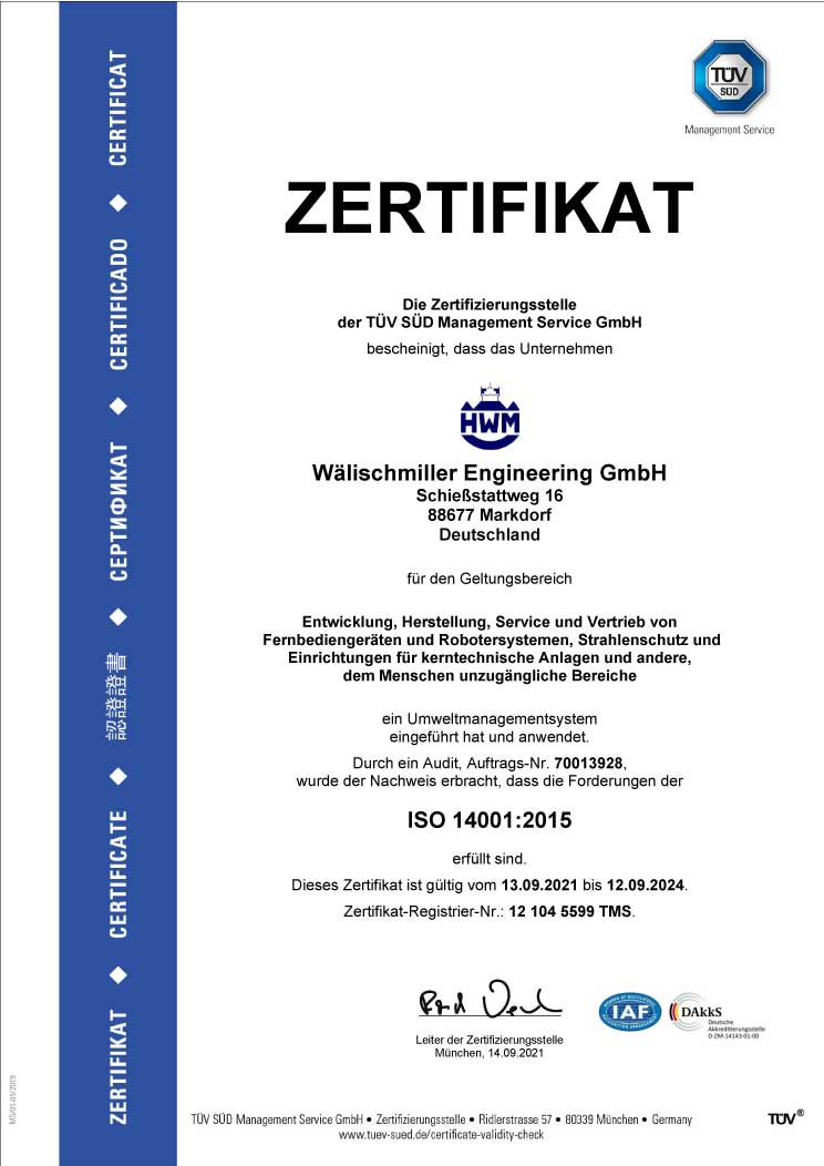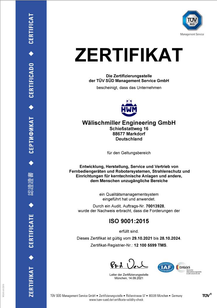 Seit mehr als 70 Jahren entwickeln und fertigen wir bei Wälischmiller Engineering Handhabungs- und Fernmanipulationstechnik für anspruchsvolle industrielle Anwendungen. Unsere Manipulatoren und robotischen Systeme kommen insbesondere dort zum Einsatz, wo Sicherheit, Präzision und Zuverlässigkeit entscheidend sind.